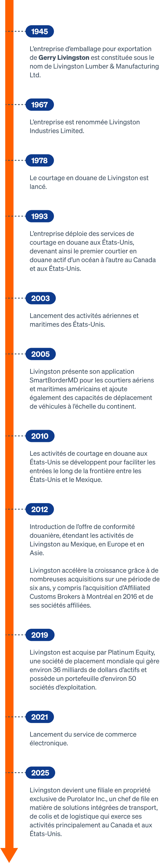 Dans le commerce mondial, tous les éléments doivent être en place pour que les marchandises puissent circuler sans heurts dans le monde entier. Livingston propose tous ces éléments. Partout dans le monde, nos clients sont assurés d’un dédouanement rapide, de conseils stratégiques, des dernières technologies, d’un service de transport fiable et, s’ils en ont besoin, d’une gestion complète du commerce mondial.